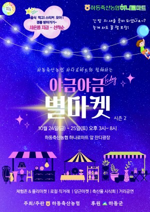 행복한 가을밤!하동축산농협, ‘야금야금(夜金) 별마켓 시즌2’ 개최10월 24~25일, 축협 하나로마트 앞 잔디광장로컬푸드·청년창업·문화 어우러진 주민 축제 하동축산농협(조합장 김구영)이 10월 24일부터 25일까지 이틀간, 하나로마트 앞 잔디광장에서 지역 주민 화합 축제인 ‘야금야금(夜金) 별마켓 시즌2’를 개최했다고 밝혔다.이번 행사는 ‘주민이 주인공이 되는 플리마켓’을 주제로, 지역 공동체 회복과 주민 간 교류 활성화를 목표로 기획되었다. 특히, 지역 로컬푸드 생산자와 청년 창업 셀러들에게 오프라인 판로와 실질적인 소득 …
